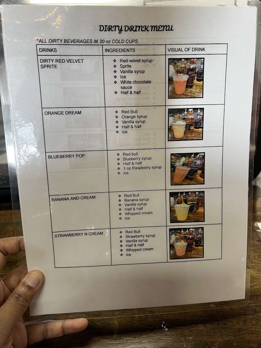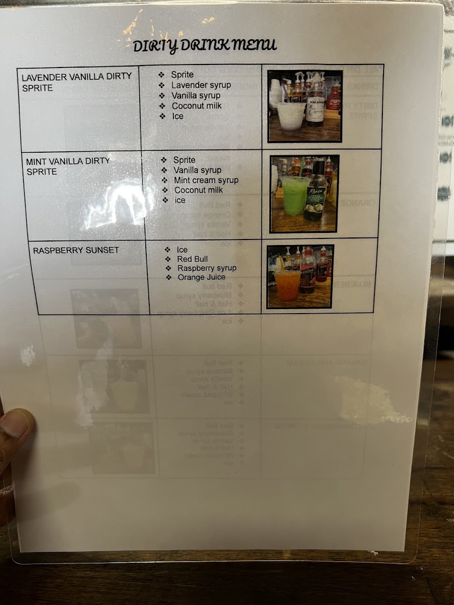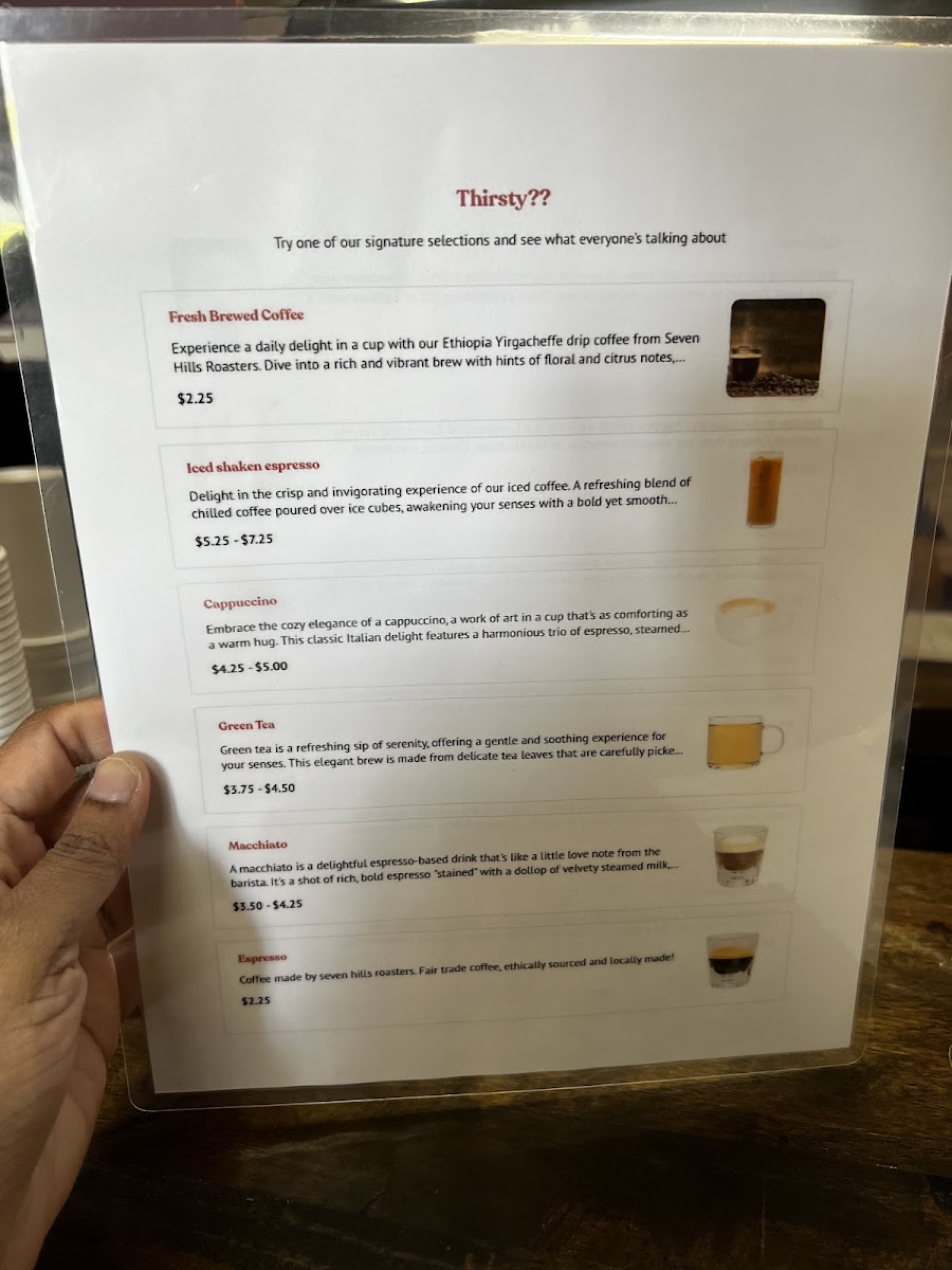 Tea selections feature hot options like apple cider, London fog, and matcha, suited for those looking for an alternative to coffee.