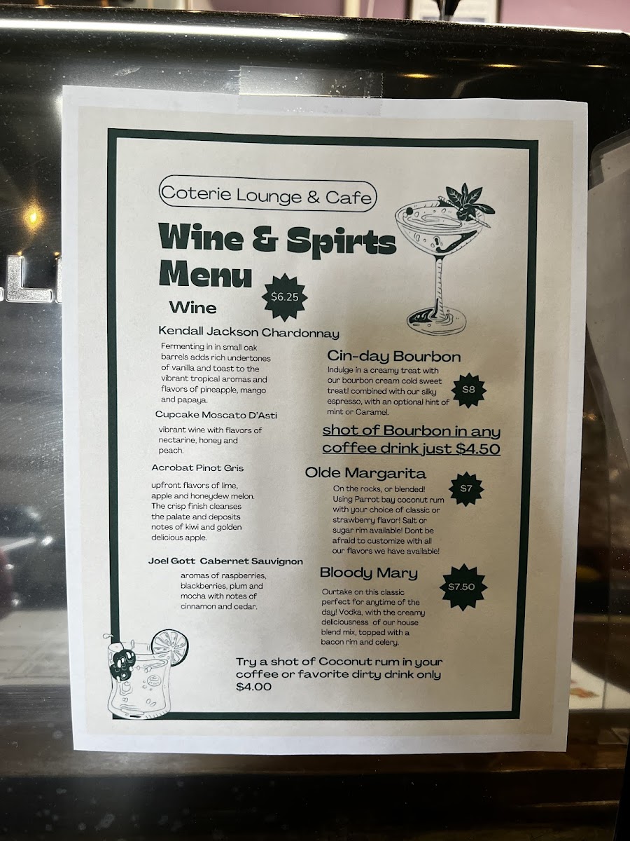 The menu at Coterie Lounge & Cafe offers a variety of options suitable for breakfast, coffee breaks, and light lunches. It is structured into several key groups including beverages, baked goods, and teas, allowing visitors to easily navigate their selections based on their preferences and time of day.